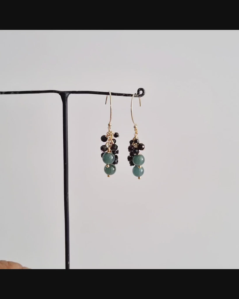 A collection of finely handcrafted earrings with blue jade and black spinel gemstone in 14k gold-filled.