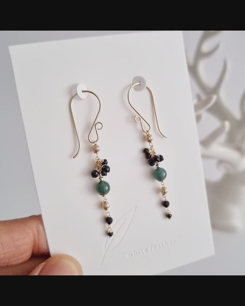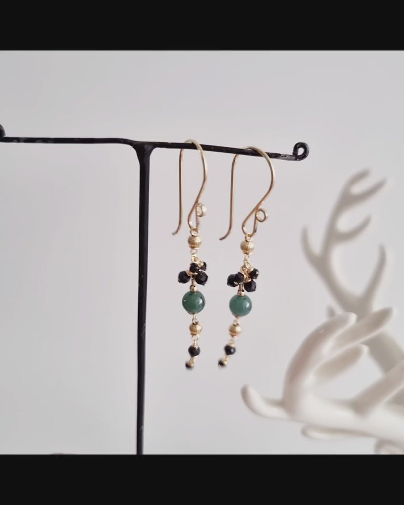 A collection of finely handcrafted earrings with blue jade and black spinel gemstone in 14k gold-filled.